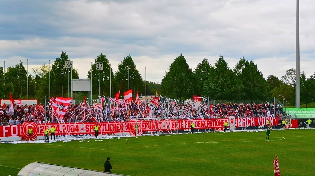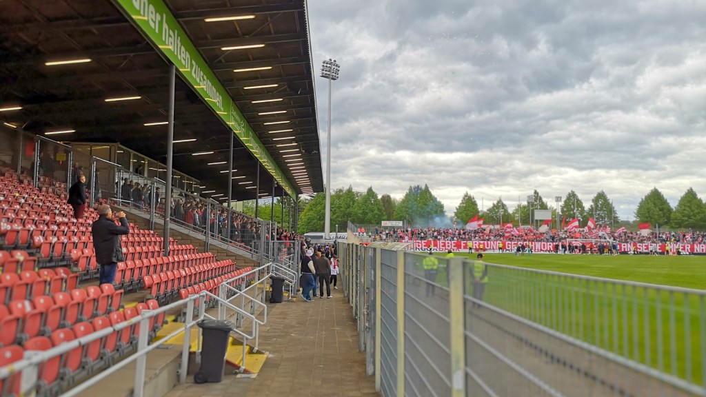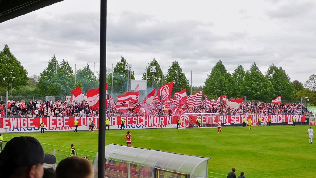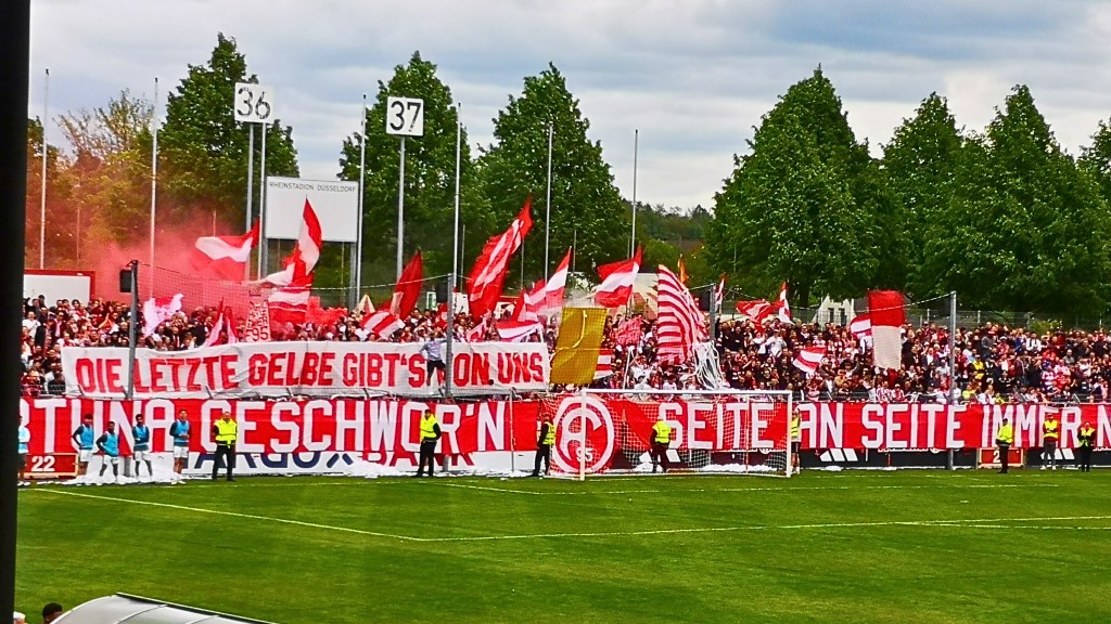 Über die komplette Tribüne hing ein Tifo „Ewige Liebe Fortuna geschwor’n – Seite an Seite immer nach vorn“, hinter welchem eine gute Mitmachquote zu verzeichnen war. Dabei wurde auch regelmäßig die Haupttribüne in Wechselgesänge eingebunden, welche bereitwillig mit einstieg und so z.B. auch einen minutenlangen Wechselgesang zelebrierten, der wahrscheinlich immer noch durch Flingern schallen würden, wenn Gladbach nicht den Ball eingelocht hätte. Untermalt wurde mit der ein oder anderen Fackel, was uns durchaus auf eine größere Pyroshow hoffen ließ. Diesen Wunsch erfüllte man uns jedoch nicht. Der einzige Gästefan saß übrigens hinter uns und brüllte bei jedem der drei Gladbach-Tore so laut herum, dass es nicht nur seiner weiblichen Begleitung maximalst unangenehm gewesen sein dürfte. Für alle anderen 2.500 Zuschauer hatte das sportliche nur am Rande eine Bedeutung. Die Zweitvertretungen von Fortuna und Gladbach stehen zwar unten drin. Da Lippstadt zurzeit jedoch keine Anstalten macht, die Klasse halten zu wollen, sind die Messen in der RL West eigentlich auch schon gelesen (Anmerkung 13.05.: Lippstadt ist mittlerweile abgestiegen). Interessiert hier keinen und muss es auch nicht, da Lippstadt wieder verliert und so der Fortuna trotz der heutigen 0:3 Niederlage den Klassenerhalt besorgt.